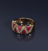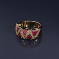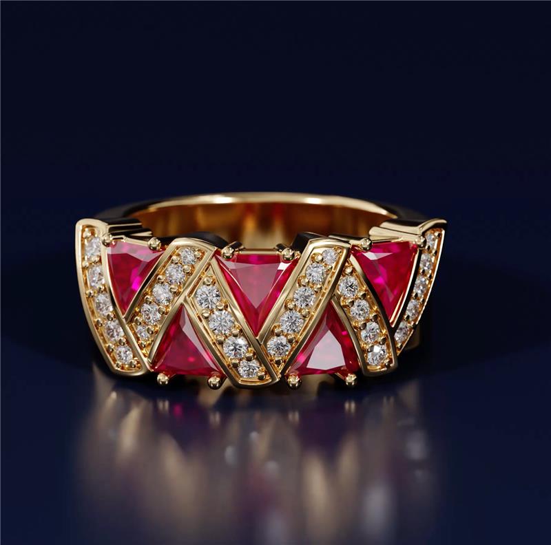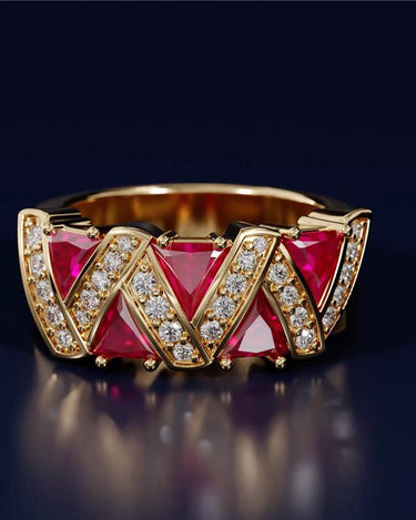 Trilliant-cut rubies burn at the heart of the ring with arcs of pavé-set diamonds that shimmer like seawater under light. The curves of gold mirror the eternal dance between passion and purity — a symbol of renewal, radiance, and sacred allure.